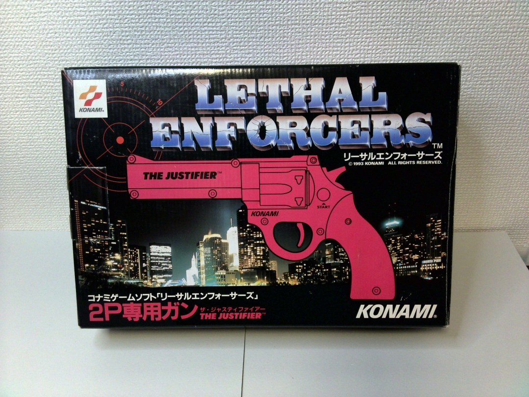 Konami’s Lethal Enforcers was one of the definitive home-shooter conversions of the early 1990s, especially in Japan arcades and home ports. The Justifier light guns—blue for Player-1 and pink for Player-2—were designed to recreate the arcade’s revolver-style feel.
